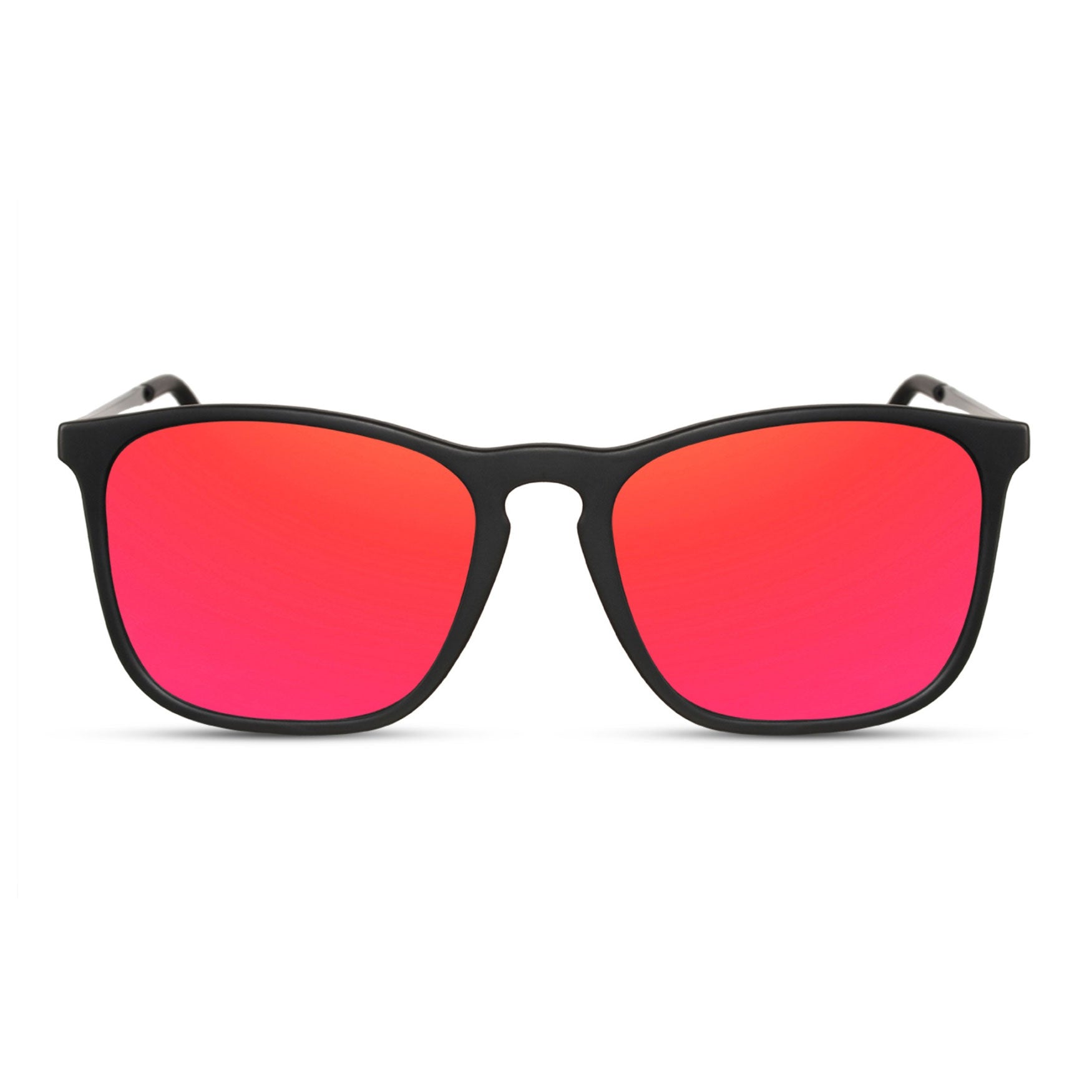 Klassiska svarta solglasögon i TR90 med röda spegelglas + vikbart case